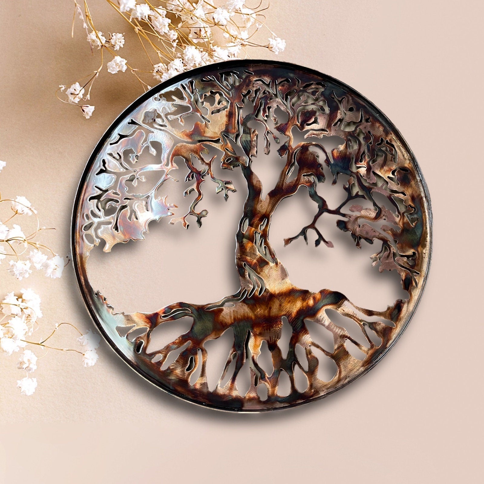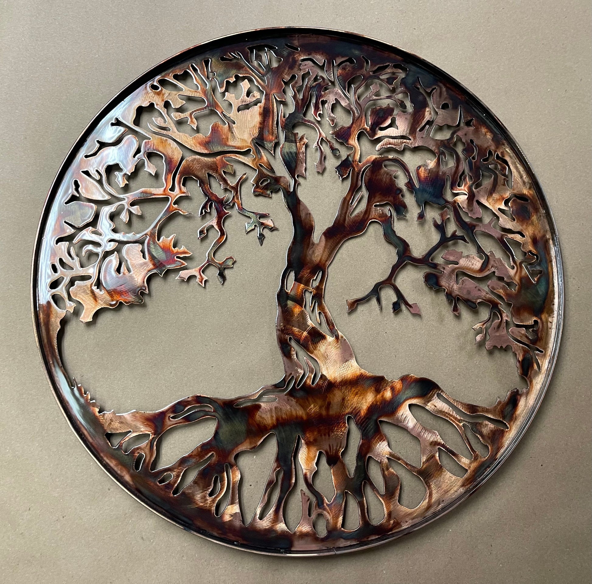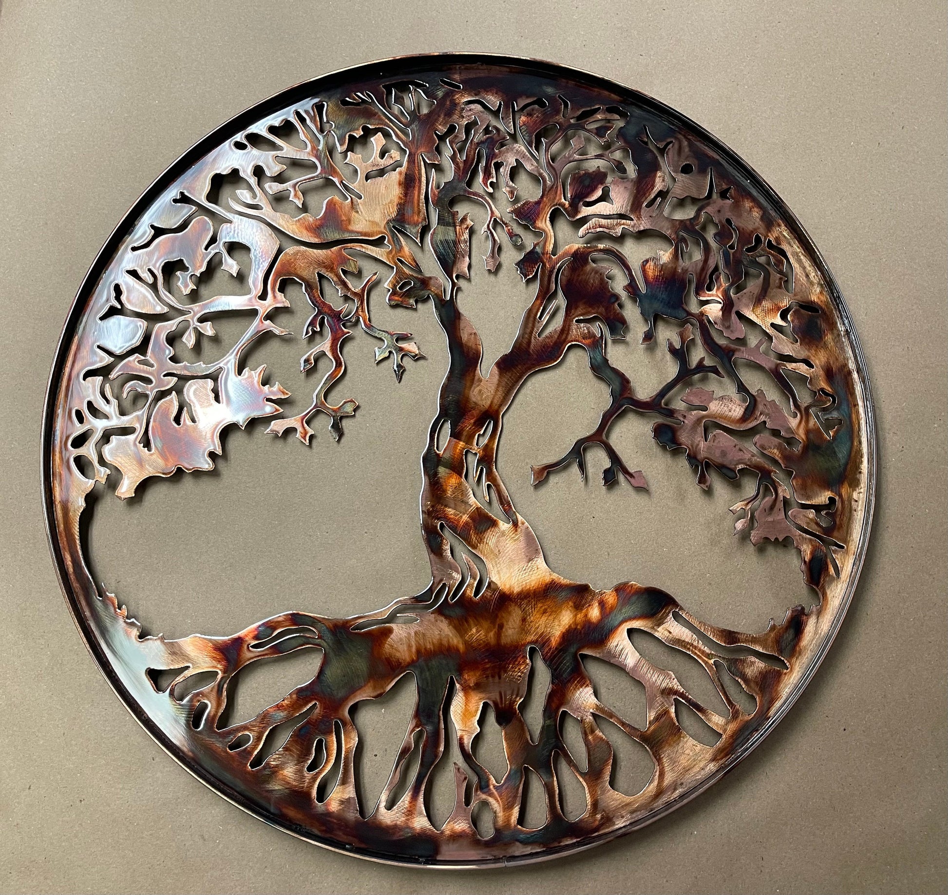 The Tree of Life concept, symbolizing the interconnectedness of all life on earth, is portrayed here with our own twist. Each piece is a one-of-a-kind creation, with a surface finish that catches light from different angles, enhancing the vibrant natural colors of steel. The coloration technique, achieved through careful heating, ensures that each artwork carries a unique charm.
