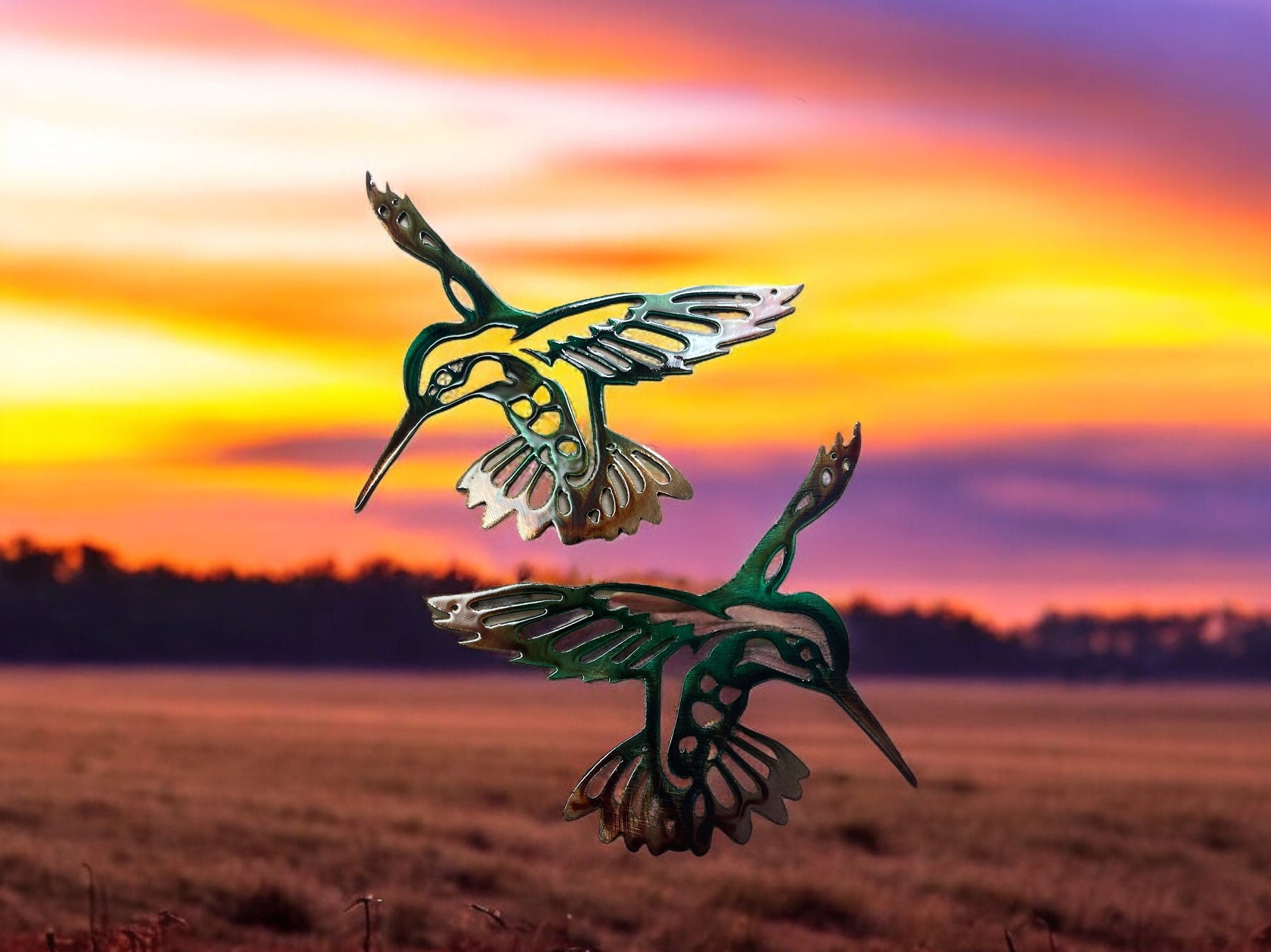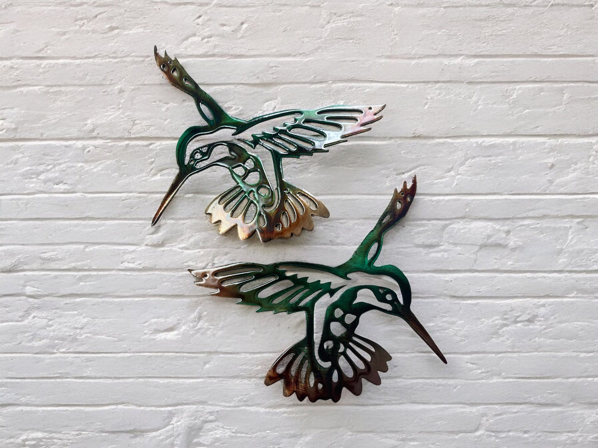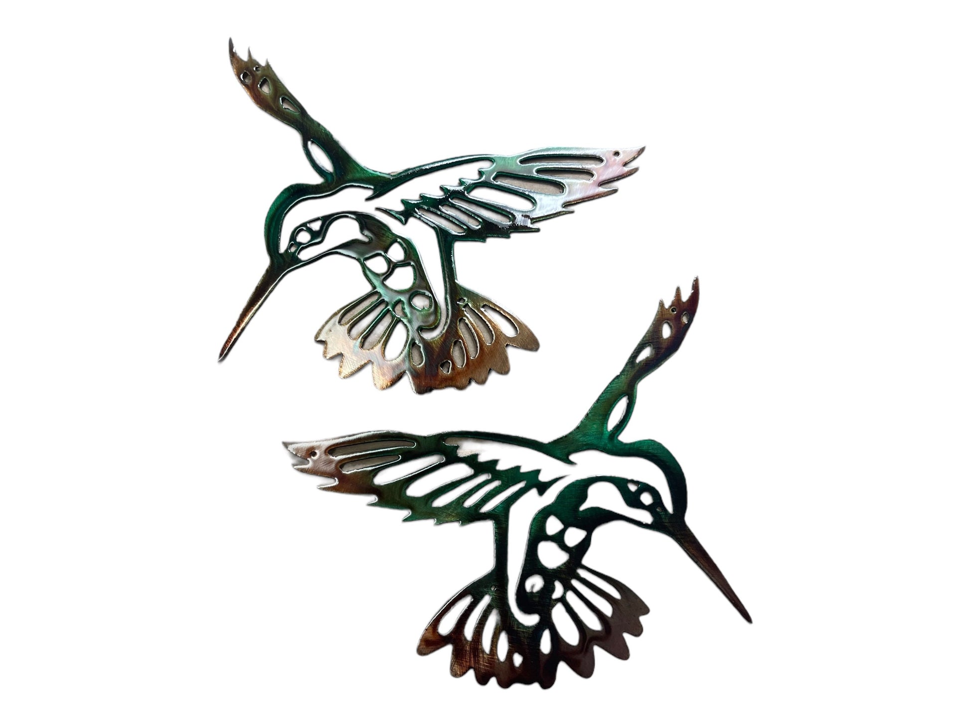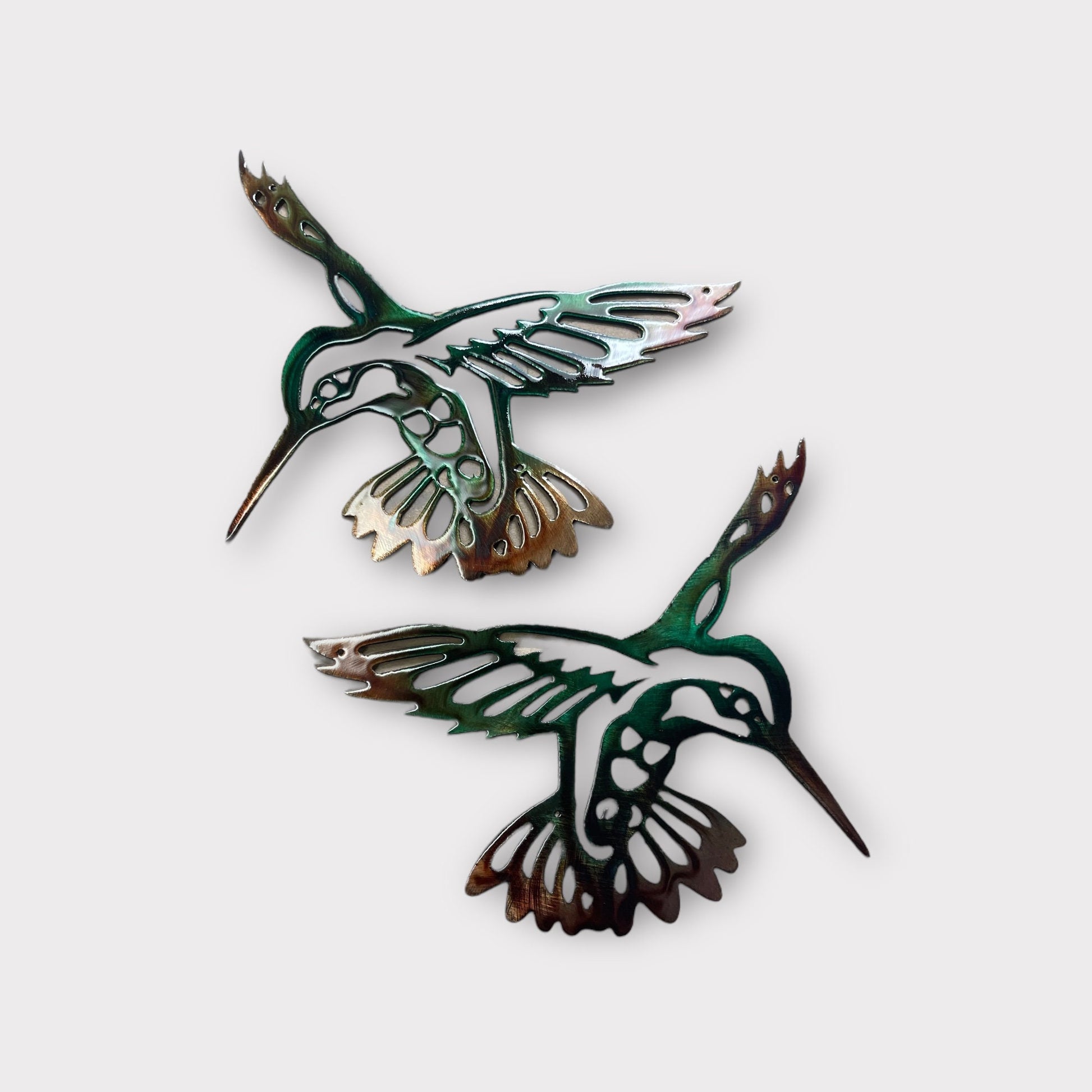 Add a touch of tropical elegance to your home with the "Autumn Green Hummingbird Pair." These exquisite pieces are meticulously crafted from mid-gauge sheet metal, showcasing the beauty and grace of hummingbirds in flight.